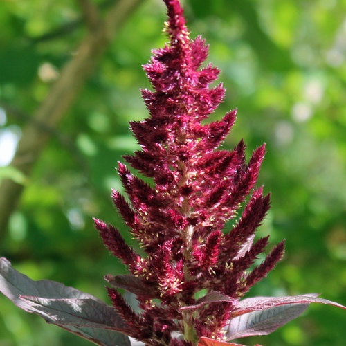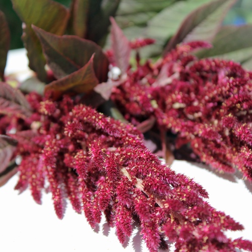 Amaranthus cruentus Aufrechte, rubinrote Blütenrispsen. Die Blätter sind grün mit bronzefarbener Überhauchung, junge Blätter sind auch komplett rot getönt. Die Samen sind ein guter Proteinlieferant. Sie können gekocht und wie Reis als Beilage gegessen werden. Da die Blütenstände sehr groß sind, ist die Samenernte sehr ergiebig. Zum Kochen verwendet man die die gleiche Menge Wasser im Verhältnis zu den Samen. Wasser aufkochen lassen, Amaranth einstreuen und bei niedriger Temperatur etwa 20 min. quellen lassen. Die Blätter sind ebenfalls essbar: junge Blätter als Salat, ältere gekocht wie Spinat. 220 Korn Standort: Sonne, Halbschatten Lebensform: einjährig Verwendbare Teile: Blätter Verwendung: Gemüse Wuchshöhe: 100cm