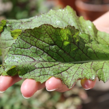 Brassica juncea ‚Red Giant’ Variante mit roten Blättern. In China heißt die Pflanze auch Tsa Tsai. Nur grob schneiden, mit Sojasoße und Asianudeln in den Wok geben und ganz kurz schwenken. 210 Korn Standort: Sonne, Halbschatten Lebensform: sät sich jedes Jahr selbst aus Verwendung: Gemüse, Essbare Blüte Verwendbare Teile: Blätter, Blüten Wuchshöhe: 40cm