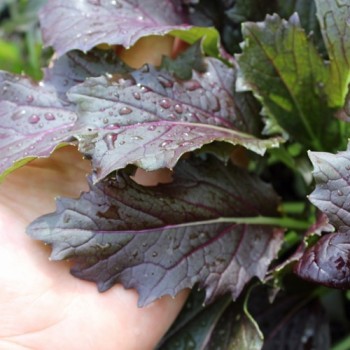 Brassica rapa var. japonica Mizuna Red hat rote Blätter mit grob gezacktem Rand. Die Blätter sind ein wunderbarer Kontrast zu den grünen Stängeln. Der kräftige Wuchs der Pflanzen, die frühe Ernte und das schnell nachwachsende Grün - hier ja eigentlich Rot - haben uns schnell begeistert. Der Geschmack ist herrlich aromatisch und leicht scharf. Junge Blätter schmecken ausgezeichnet im frischen Salat, ältere Blätter sind ein schmackhafter Brotbelag für die Gärtnerpause. 110 Korn Standort: Sonne, Halbschatten Lebensform: einjährig Verwendbare Teile: Blätter Verwendung: Gemüse Wuchshöhe: 25cm