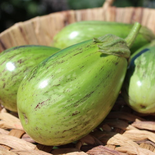 Solanum melongena Herrlich glänzende, apfelgrüne Auberginen mit lila Streifen. Es ist eine Sorte aus Katalonien um die Stadt Manresa in Spanien. Nur dort angebaut und keine Handelssorte. Es ist eine Aubergine mit mildem Geschmack wie wir es bei Auberginen mögen, aber diese hier hat Persönlichkeit! Als marinierte Auberginen ein leckerer Teil der Hauptspeise. Im Mittelmeerraum wird meist ja nicht nur das eine Hauptgericht gereicht, sondern viele kleine Köstlichkeiten, warm und kalt, alles durcheinander, zum Schluss gibt es noch Nachtisch: Obst oder süße Teilchen vom Konditor. Rezept: marinierte Auberginen (kalt gegessen) Dafür braucht man ausgewachsene Auberginen, Olivenöl, 150ml Balsamico und 150ml Wasser, 3 Knoblauchzehen, frischen Oregano und Salbei, Salz und Pfeffer. Auberginen in Scheiben schneiden, mit Olivenöl bestreichen und auf dem Grill oder der Grillpfanne rösten bis das Fleisch weich geworden ist und sich schöne braune Grillstreifen gebildet haben. Wasser und Essig mischen, die Scheiben durch das Wasser ziehen und in eine Auflaufform legen. Ist der Boden bedeckt, etwas Ölivenöl, Salz, gehackten Knoblauch und Kräuter darüber geben. Danach weiterschichten und jede Schicht wieder würzen und etwas Öl darübergeben. Im Kühlscharnk durchziehen lassen. 10 Korn Standort: Sonne, Halbschatten Lebensform: einjährig Verwendbare Teile: Früchte Verwendung: Gemüse Wuchshöhe: 70cm