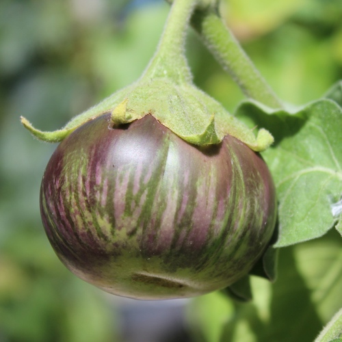 Solanum melongena Eine mehrfarbige Aubergine mit schönem Farbspiel. Die eierförmigen Früchte haben einen hellgrünen Grundton mit lila und dunkelgrünen Streifen. Werden die Früchte von Blättern schattiert, bleiben sie auch mal ganz grün. In voller, praller Sonne sind sie dagegen bunt gefärbt. Ab August ist Erntezeit. Das Fruchtfleisch saugt jeden Geschmack auf, den sie ihm geben. Gegrillte Scheiben, nur mit etwas Olivenöl, Salz und Knoblauch eingerieben, schmecken einfach köstlich. Auch in indischen Currys sehr lecker. 10 Korn Standort: Sonne, Halbschatten Lebensform: einjährig Verwendbare Teile: Früchte Verwendung: Gemüse, Heilen Wuchshöhe: 70cm