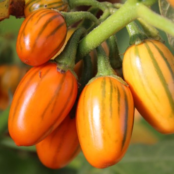 Solanum aethiopicum Eine afrikanische Aubergine, die intensiver schmeckt als “normale” Auberginen. Sie werden wie die anderen afrikanischen Auberginen meist unreif und in irgendeiner Form verarbeitet gegessen. Bei Reife verfärben sie sich orange mit gelben Streifen – sehr dekorativ! Die Pflanzen sind kälteverträglicher als andere Sorten. Die Früchte reifen über gelb, hellorange, orange ab. Dabei sind schon im jungen Stadium die Streifen zu sehen! 10 Korn Standort: Sonne, Halbschatten Lebensform: einjährig Verwendbare Teile: Früchte Verwendung: Gemüse Wuchshöhe: 60cm