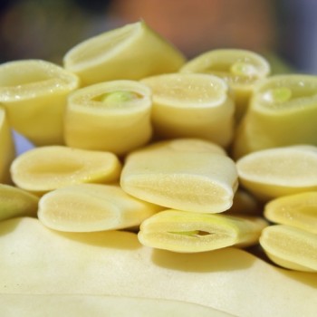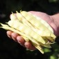 Phaseolus vulgaris var. nanus Tytania ist eine Sorte mit äußerst breiten, gelben Hülsen. Die Sorte ist einfach unglaublich, man kann sie von Mitte Mai bis Ende Juli aussäen und sie wächst. Man kann sie in jedem Stadium ernten und sie bleibt butterzart. Jung geerntet sind die Hülsen schon ziemlich groß, man erkennt sie an der grün-gelben Farbe. Sie hat dann schon die Größe einer normalen Buschbohne. Noch länger hängen gelassen, werden sie noch gelber, noch breiter und noch größer. Ganz dick, dann wenn andere Bohnensorten nicht mehr unbedingt beerntbar sind, knacken die Hülsen immer noch wenn man sie in zwei Hälften bricht und zeigen ihr saftiges Innenleben ohne jegliche Fäden. Die kann man prima essen und sie schmecken immer noch herausragend gut. Die Kornfarbe ist ebenfalls etwas besonderes, es ist ein seltenes braun-oliv. Diese Bohne kann man als Butterbohne, als Brechbohne, im Bohnensalat oder der Bohnensuppe essen. Wir haben damit auch schon fermentierte Bohnen gemacht. Rezept: Bohnen pflücken, waschen und 7 min kochen. In ein Einmachglas füllen, etwas Bohnenkraut dazugeben und mit 2%iger Salzlösung auffüllen (20g Meersalz in 1 Liter Wasser auflösen). Die Bohnen sollten komplett mit Salzlake bedeckt sein. Mit einem abgekochten Stein oder einem kleineren Glasdeckel beschweren, damit die Bohnen unter Wasser bleiben. Den Deckel locker aufsetzen und maximal mit Klammern verschließen. 5 Tage bei Zimmertemperatur stehen lassen - fertig. Die fertigen Bohnen entweder sofort aufessen oder in den Kühlschrank / kalten Keller stellen. Halten dort mindestens Jahr. Bild 4: frisch angesetzte fermentierte Bohnen aus ganz jungen Hülsen (passten besser ins Glas) Bild 7: ganz junge Hülsen sind noch gelbgrün aber schon groß Bild 8: selbst ganz dicke, fast schon zu alte Bohnenhülsen sind noch komplett zart und fadenfrei 20 Korn Standort: Sonne, Halbschatten Lebensform: einjährig Verwendbare Teile: Hülsen, Kerne Verwendung: Gemüse Wuchshöhe: 30cm