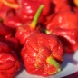 Capsicum chinense Besonderes Merkmal sind die Kelchblätter, die nicht wie bei allen anderen Chilisorten typisch grün gefärbt sind, sondern rot! Es ist eine rare Sorte der berühmten 7 Pots. Diese heißen so, weil sie fähig sein sollen, Geschmack und Schärfe in sieben Eintöpfe zu bringen (1 Schote wohlgemerkt). Gezüchtet wurde die Sorte durch Kreuzung von Trinidad Scorpion Moruga und 7 Pot Yellow. Bei diesen Eltern ist auch nicht verwunderlich, dass 7 Pot Bubblegum ultrascharf ist. 10 Korn Standort: Sonne, Halbschatten Lebensform: mehrjährig Verwendbare Teile: Früchte Verwendung: Würzen Wuchshöhe: 110cm