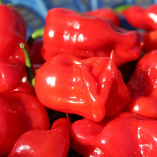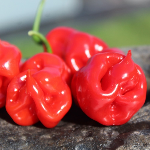 Capsicum chinense Wenn man einen sehr scharfen, aromatischen Chili mit einem milden, stark duftenden Chili kreuzt, was könnte wohl dabei rauskommen? Na klar, Faddas Reaper Perfume, denn er wurde mit Carolina Reaper Caramel und Trinidad Perfume kreirt. Es ist ein sehr gut duftender, mit bestem Geschmack versehener Chili in leuchtendem Rot. Vorn geformt als ob die Spitze einmal rausgezogen und wieder reingedrückt wurde. Es ist eine Sorte neueren Datums, von der Form her stabil, wir haben weiter nach früher Reife selektiert. Alle Pflanzen, die nicht Anfang September reif waren, wurden nicht weiter vermehrt. Und nun ist er perfekt! 10 Korn Standort: Sonne, Halbschatten Lebensform: mehrjährig Verwendbare Teile: Früchte Verwendung: Würzen Wuchshöhe: 70cm