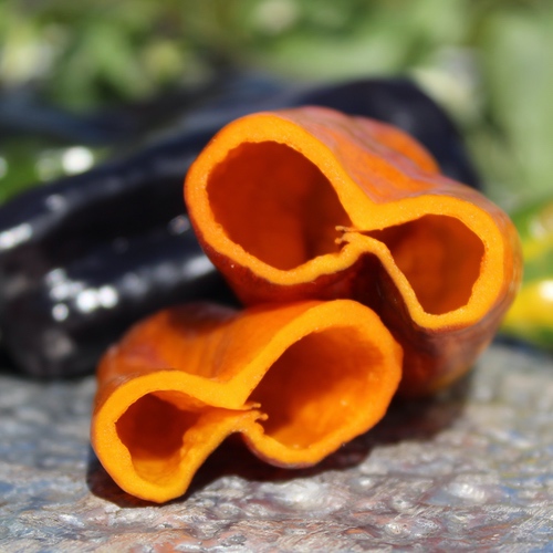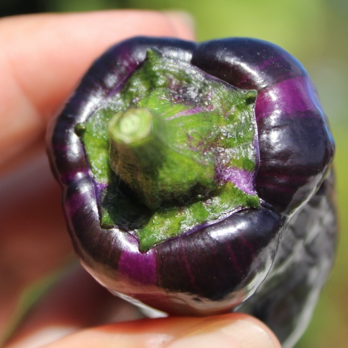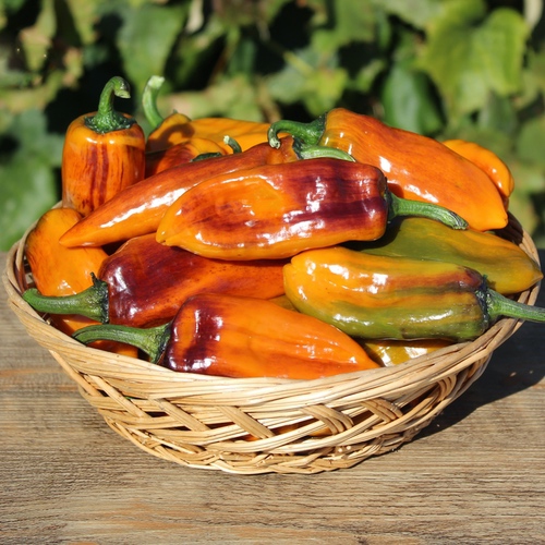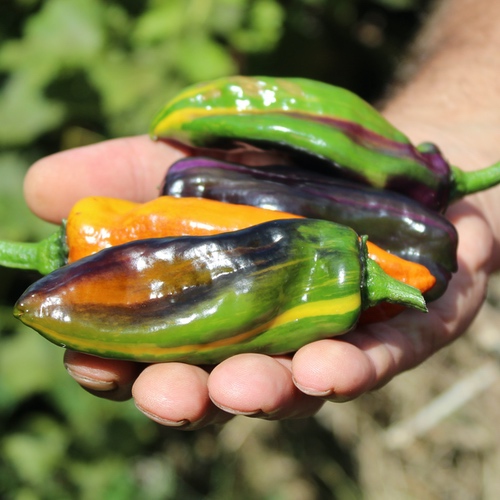 Capsicum annuum Sehr großer, brillant-farbiger Chili. Im Reifeverlauf mit gelben, violetten und orangefarbenen Streifen versehen. Es ist eine der aufregendsten Neuheiten der letzten Zeit. Der Geschmack ist süß und scharf, die Schärfe ist dabei völlig in Ordnung, die Zunge brennt nicht weg, sondern bleibt dran. Wir fanden ihn ziemlich lecker, ihn ihm steckt die süße Sorte Sugar Rush, also auch kein Wunder. Probieren Sie einmal folgendes Rezept, das sollte man immer im Kühlschrank haben. Es schmeckt gut zu gegrilltem Gemüse oder Fleisch, über gekochtes Ei oder als Soße über frischem Blattgemüse aus dem Garten oder über geröstetes Brot geträufelt:Rezept Chimichuri 6 EL gehackte Petersilie4 EL Majoran oder Oregano3 EL entkernte und gehackte Chili3 geriebene Knoblauchzehen3 EL Rotweinessig6 EL Olivenöl1 Prise MeersalzAlles in ein Glas geben und schütteln. Hält sich im Kühlschrank mehrere Wochen und schmeckt am besten, wenn es einige Zeit durchziehen durfte. 10 Korn Standort: Sonne, Halbschatten Lebensform: mehrjährig Verwendbare Teile: Früchte Verwendung: Würzen Wuchshöhe: 80cm