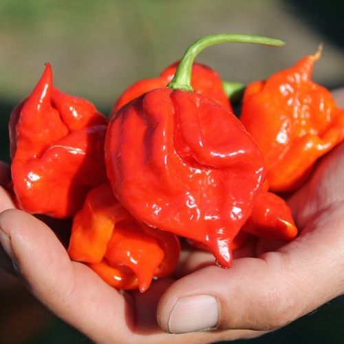 Capsicum chinense Typisch ist die schwanzartige Spitze, die aus der Frucht herausschaut, daher auch der Name „Scorpion“, in Anlehnung an einen Scorpionstachel. Es ist eine äußerst scharfe Sorte, die aus der Karibik stammt und von grün über orange nach rot abreift. Sie haben einen perfekt ausbalancierten, fruchtigen Geschmack. 10 Korn Standort: Sonne, Halbschatten Lebensform: mehrjährig Verwendbare Teile: Früchte Verwendung: Würzen Wuchshöhe: 110cm