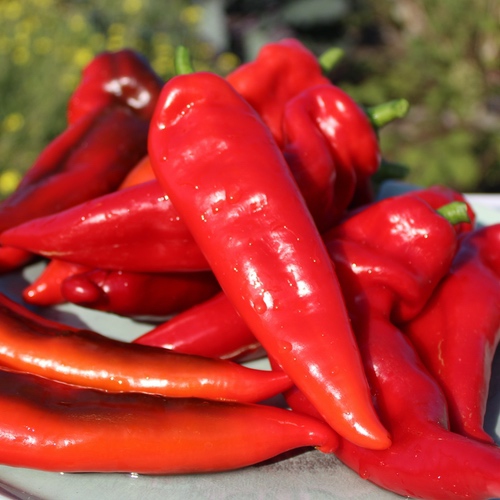 Nicht scharf oder nur ganz leicht scharf schmeckt dieser kroatische Chili. Das Fruchtfleisch schmeckt lecker fruchtig, süß, saftig und aromatisch. Die Größe liegt bei 15-20cm. Der Sortenname bedeutet „zum Auffädeln“, denn er wird traditionell getrocknet und zu Pulver verarbeitet.