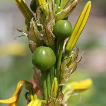 Asphodeline lutea Sehr lecker sind die Blüten von Affodill. Sie haben ein tolle Konsistenz, nicht zu weich, sondern leicht knackig, ähnlich wie Taglilien, aber süßer. Jede Blüte erscheint nur einen Tag, es werden jedoch davon so viele zeitversetzt um die gesamte Blütenkerze gebildet, so dass es nicht von Nachteil ist, wenn man an einem Tag alle auf einmal erntet. Die Pflanzen bilden Rosetten mit grasähnlichen Blättern am Boden und schieben die bis zu 70cm hohen Blütenstände hoch. In sehr heißen, trockenen Sommern verschwindet sie durchaus schon mal in kühleren Bodenschichten, treibt aber im Frühjahr wieder zuverlässig durch. Früher wurde die Art in Griechenland auch wegen ihrer essbaren Wurzel kultiviert, die zusammen mit Feigen im Ofen gegart und wie Kartoffeln gegessen wurden. 10 Korn Standort: Sonne, Halbschatten Lebensform: winterhart, mehrjährig Verwendbare Teile: Blüten Verwendung: Essbare Blüten, Wurzeln, Bienen- und Insektenweide Wuchshöhe: 70cm