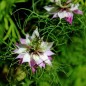 Nigella damascena Die Jungfer im Grünen in der Farbe rosa. Die botanische Bezeichnung „damascena“ bedeutet „aus Damaskus“ stammend. Sie wird manchmal auch Damaszener Kümmel genannt, ist sie doch eng mit dem Schwarzkümmel verwand. Der österreichische Name „Gretchen im Busch“ spielt auf die Sage an, dass sich eine Bauerntochter wegen unerfüllter Liebe in diese Pflanze verwandelt haben soll. Die Pflanzen waren schon früher sehr oft in Bauerngärten anzutreffen, weshalb es nicht verwunderlich ist, dass die Menschen Geschichten um sie herum erfanden. Die Blüten sind umhüllt von einem Kranz aus dünnen Blattfäden. Aus den kleinen Blüten entstehen erstaunlich dicke Samenkapseln, die voll mit schwarzen, essbaren Samen gefüllt sind. Diese schmecken nach Waldmeister. 320 Korn Standort: Sonne, Halbschatten Lebensform: einjährig Verwendbare Teile: Blüten, Samen Verwendung: Essbare Blüten, Würzen, Bienen- und Insektenweide Wuchshöhe: 30cm