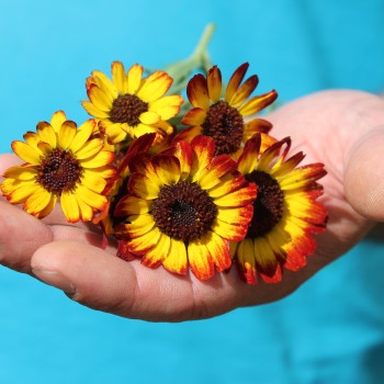 Chrysanthemum segetum Rote Blüten mit einem gelben Ring, die Röhrenblüten in der Mitte sind dunkel. Es ist eine kontrastreiche Farbkombination, die auch in der deutschen Flagge vorkommt, daher der Name. Die Sommermargerite ist nicht nur eine hübsche essbare Blüte, sondern auch eine ausgezeichnete Schnittblume mit den festlichen, margeritenähnlichen Blüten. Als Korbblütler eine wichtige Nahrungspflanze für Nützlinge im Garten. 140 Korn Standort: Sonne, Halbschatten Lebensform: einjährig Verwendbare Teile: Blüten, Blätter Verwendung: Essbare Blüten, Salat, Bienen- und Insektenweide Wuchshöhe: 60cm
