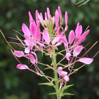 Cleome spinosa Der Name leitet sich aus den lang hervorstehenden Staubfäden ab, die wie Spinnenbeine aussehen. Im englischsprachigen Raum heißen sie „Cats Whiskers“, also Katzen-Schnurrbart. Spinnenblumen sind elegante Schönheiten mit langen Blütenrispen und langer Blütezeit. Verblühtes wird selbstständig abgeworfen, oberhalb werden ständig neue Knospen gebildet, die sich dann zeitversetzt öffnen. Das erste Mal bin ich der Spinnenblume im Garten meiner Großtante begegnet, das war vor vielen Jahren. Meine Großtante ist leidenschaftliche Gartenschaugängerin, dabei „fallen“ ihr auch ab und zu mal einige Samen von besonderen Blumen in die Jackentasche. 20 Jahre nach der Landesschau in ihrer Heimatstadt gab es die Spinennblumen immer noch in ihrem Garten. „Ich mach da nix, die säen sich immer selbst aus. Ein paar lass ich stehen, was stört, fliegt raus.“ Tatsächlich werden Spinnenblumen nie zur Plage, denn sie säen sich nur an freien, ungenutzten Stellen aus. Cherry Queen hat kirschrote, essbare Blüten. 330 Korn Standort: Sonne, Halbschatten Lebensform: einjährig Verwendbare Teile: Blüten Verwendung: Essbare Blüten, Bienen- und Insektenweide Wuchshöhe: 100cm