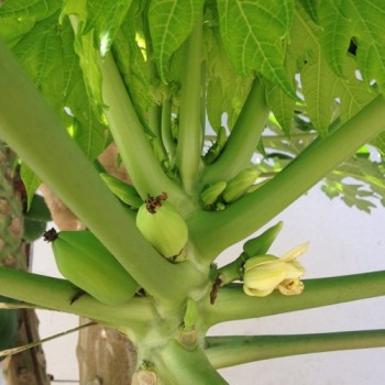 Carica papaya In Kuba ,Fruta de Bomba‘ genannt und es ist ja auch eine Bombe! Reich an Mineralien und Vitaminen. Die Pflanze entwickelt einen Stamm, an dessen Ende sich Früchte entwickeln. Natürlich nicht so reichtragend wie in den Tropen, kann man bis zu 10 Früchte ernten, vorrausgesetzt ist natürlich, dass sie das ganze Jahr dauerhaft warmen Temperaturen ausgesetzt ist mit einer relativ hohen Luftfeuchte. Das Fruchtfleisch ist orange und duftet vollreif intensiv, dann geben die Früchte auch auf Druck nach. Weniger bekannt ist, dass die Samen ebenfalls genutzt werden: sie schmecken wie Pfeffer und enthalten wertvolle Enzyme. 20 Korn Standort: Sonne, Halbschatten Lebensform: mehrjährig Verwendung: Obst, Würzen Verwendbare Teile: Früchte, Samen Wuchshöhe: 350cm