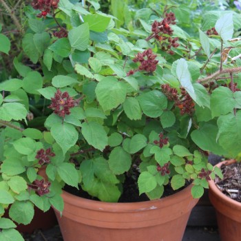Rubus phoenicolasius Erfrischend weinartiger Geschmack. Die durchscheinenden Beeren glänzen im Sommer verlockend und sind eine willkommene Abkühlung an heißen Tagen. Die Pflanze ist über und über mit weichen, roten Drüsenhaaren bedeckt, sehr skuril! Die Japanische Weinbeere kann auch im Kübel gezogen werden. Die langen Ruten im Herbst zurückschneiden und der Pflanze spätestens im Frühling neue Erde geben. Im Foto wächst sie in einem Tontopf mit 35cm Durchmesser. Standort: Sonne, Halbschatten Lebensform: winterhart, mehrjährig Verwendung: Obst, Heilen, Essbare Blüten Verwendbare Teile: Früchte, Blätter, Blüten Wuchshöhe: 120 cm Topfgröße: 1,1l