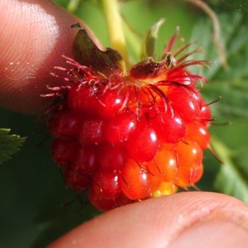 Rubus spectabilis Eine Sorte der Lachsbeere mit gefüllten, rosa Blüten. Und wer hätte das gedacht: sie bilden große, rote Früchte! Diese sind etwa 3cm groß. Aus unserer Dokumentation: "Wir sind uns nicht ganz sicher, ob die Lachsbeeren selbstfruchtbar sind. In der Literatur wird die Art als selbstfruchtbar angegeben. Beide Sorten - Lachsbeere orange und Olympic Double - wachsen bei uns nahe beieinander und tragen Früchte. Isoliert angepflanzt, war das nicht immer so." Standort: Sonne, Halbschatten Lebensform: winterhart / mehrjährig Verwendung: Obst Verwendbare Teile: Früchte Wuchshöhe: 120cm Topfgröße: 1,1l