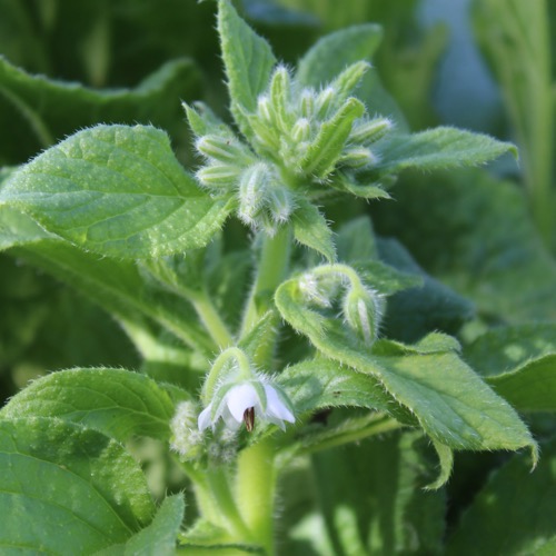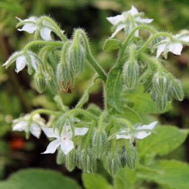 Borago officinalis ‚Alba’ Eine seltene Form des Borretschs, nämlich mit weißen Blüten. Die Pflanzen wachsen schnell, so dass schon wenige genügen, um reichlich Blätter ernten zu können. Diese entweder traditionell dem Gurkensalat oder Kopfsalat hinzufügen. In Aragonien, im Nordosten Spaniens, wird Borretsch nicht als Kraut zum Würzen, sondern als Gemüse gegessen (siehe Borretschsuppe). Ein lecker Nachtisch wird ebenfalls aus den Blättern gemacht. Rezept: Crespillos de Borraja - ein süßer Nachtisch 800g Borretschblätter, 300g Mehl, 200g Zucker, 2 Eier, etwa 150 ml Milch, Öl zum Ausbacken Mehl, Eier und Milch miteinander vermischen, die Borretschblätter darin eintauchen und in heißem Öl ausbacken bis der Teig hellbraun ist. Sofort nachdem sie aus dem Topf gefischt werden, in reichlich Zucker wälzen. 30 Korn Standort: Sonne, Halbschatten Lebensform: einjährig Verwendbare Teile: Blätter, Blüten Verwendung: Würzen, Gemüse, Bienen- und Insektenweide Wuchshöhe: 70cm