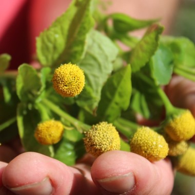 Spilanthes acmella Parakresse mit rein gelben Bütenköpfen. Der Geschmack ist prickelnd scharf auf der Zunge. Es ist eine ganz eigene, langanhaltende Schärfe, nicht vergleichbar mit Pfeffer, Chili oder Meerrettich. Beim Kochen verliert sich die Schärfe etwas, dann als Gemüse, was geschmacklich mehr in Richtung „grün“ geht. Die Pflanzen wachsen überall, Topf, Beet, selbst ganz niedrige Behälter reichen. Die Triebe verhalten sich halbkriechend. Die Blätter sind eine interessante Alternative zum scharfen Würzen, wenn man mal was Neues ausprobieren möchte. 170 Korn Standort: Sonne, Halbschatten Lebensform: einjährig Verwendbare Teile: Blätter Verwendung: Küche, Würzen Wuchshöhe: 30cm