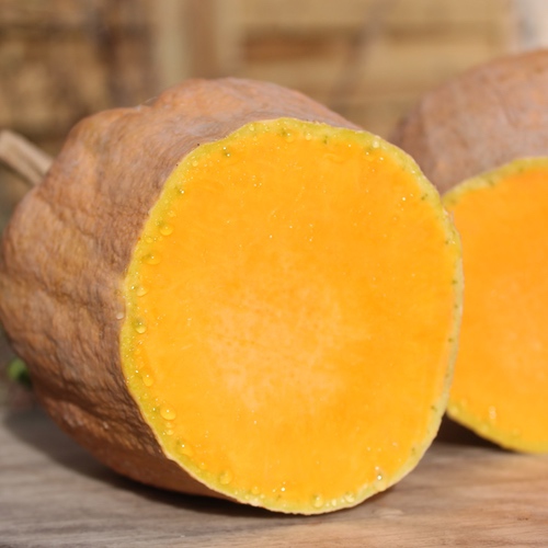 Cucurbita moschata Italienischer Butternut in der Form einer großen Erdnuss. Die Schale ist beige, leicht bereift, manchmal gerillt und etwas dellig. Der Geschmack ist ausgezeichnet, süß-fruchtig mit feinem, nussigen Unterton. Das Fruchtfleisch hat eine feste Konsistenz. Wie alle Butternuts auch echt einfach zu verarbeiten: Den Kürbishals in Stücke schneiden, sie bestehen komplett aus Fruchtfleisch. Nur unterhalb befindet sich das Kerngehäuse. Hält sich vier bis sieben Monate. 7 Korn Standort: Sonne, Halbschatten Lebensform: einjährig Verwendbare Teile: Früchte, Blüten Verwendung: Gemüse Wuchshöhe: 40cm