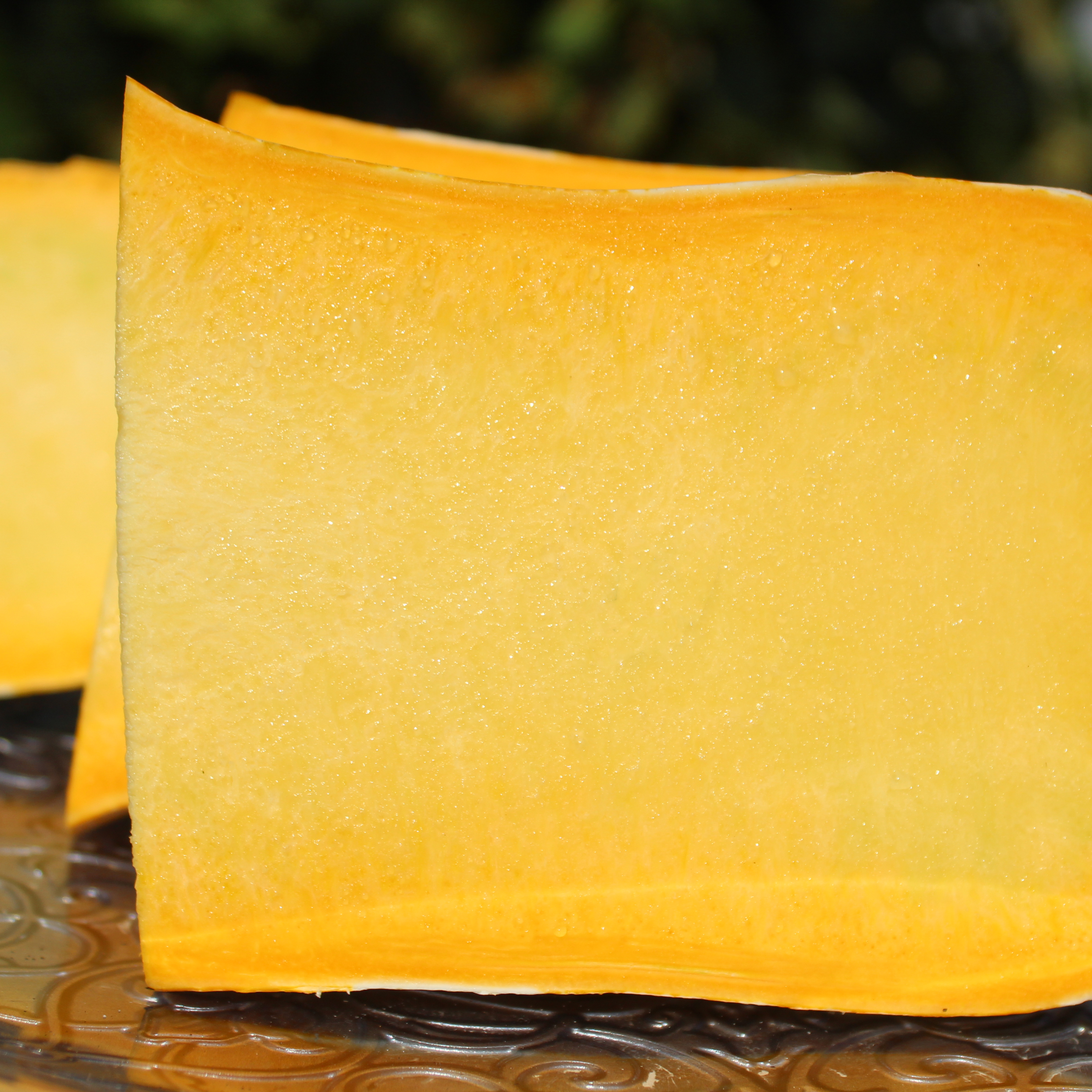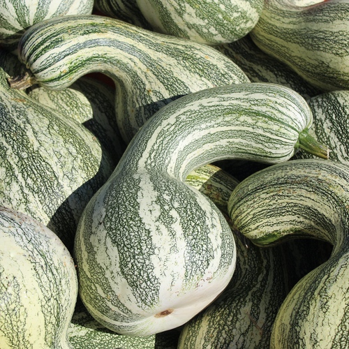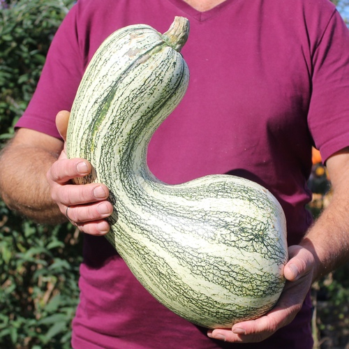 Cucurbita argyrosperma Große, birnenförmige Früchte mit langem Hals. Die Schale ist dunkelgrün mit dicken weißen Streifen. Der Hals allein ist sehr ergiebig, es befinden sich keine Kerne darin, sondern reines Fruchtfleisch. Es ist eine indianische Sorte mit langer Geschichte. Es wird angenommen, dass der Cushaw-Kürbis irgendwann zwischen 7000 und 3000 v. Chr. domestiziert wurde. Es war der beliebteste Kürbis der Hopi-Indianer und es war die Frucht, die europäischen Einwanderern als Lebengrundlage diente. Das Fleisch schmeckt leicht süßlich. Dieser Kürbis liefert viel Vitamin C und verliert dessen Gehalt auch nicht durch Lagerung. 7 Korn Standort: Sonne, Halbschatten Lebensform: einjährig Verwendbare Teile: Früchte, Blüten Verwendung: Gemüse Wuchshöhe: 40cm