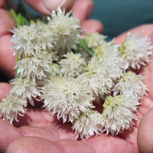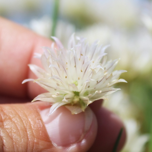 Allium schoenoprasum ‚White Bere’ Schnittlauch kann man nie genug haben. Wir haben eine Reihe mit verschiedenen Sorten auf dem Acker gepflanzt, zur Blütezeit ganz, ganz toll und das auch noch im Frühjahr, wenn es noch nicht viele andere Blühpflanzen gibt. White Bere fällt da zwischen den verschiedenen, weißen Sorten auf, denn das weiß ist weißer, viel klarer und leuchtender als bei anderen. Woher der Name „Bere“ und die eigentümliche Schreibweise stammt ist unbekannt. Ich weiß nur, dass es eine Sorte aus Großbritannien ist, von der britischen Gärtnerei Edulis. Standort: Sonne, Halbschatten Lebensform: winterhart, mehrjährig Verwendbare Teile: Blätter, Blüten Verwendung: Würzen, Essbare Blüte, Heilen, Duft Wuchshöhe: 30cm Topfgröße: 0,35l