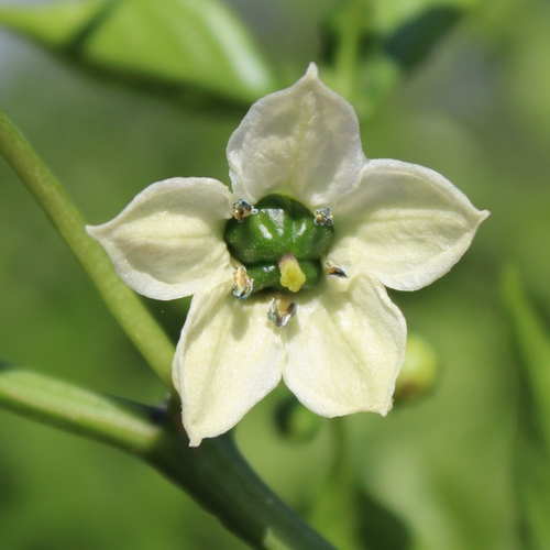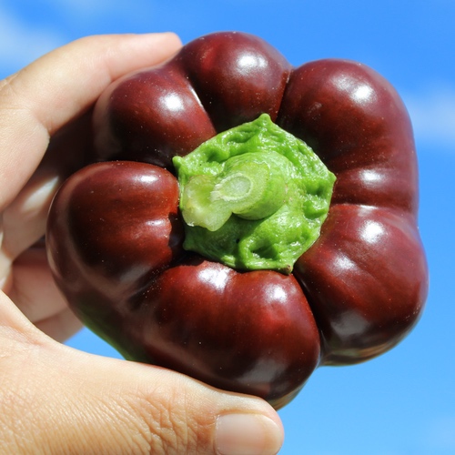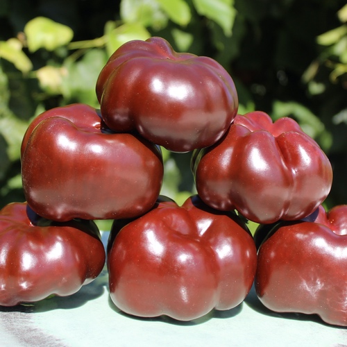 Capsicum annuum Schön große, plattrunde und gerippte Früchten in schokoladenbraun. Die Früchte haben einen Durchmesser von gut 12cm. Super dickwandig, innen rotbraun. Der Geschmack ist herrlich süß-saftig und sehr fruchtig. Es ist ein besonders gutes Aroma. Zum Essen direkt von der Pflanze oder zum Füllen. Sind zu viele auf einmal dran, dann einfrieren für den Winter, das schmeckt im Gulasch immer gut. Diese Sorte wurde in Österreich selektiert, es ist eine Kreuzung aus einer braunen und einer tomatenförmigen Sorte. Der erste und bisher einzige Tomatenpaprika in braun. 10 Korn Standort: Sonne, Halbschatten Lebensform: einjährig Verwendbare Teile: Früchte Verwendung: Gemüse Wuchshöhe: 70cm