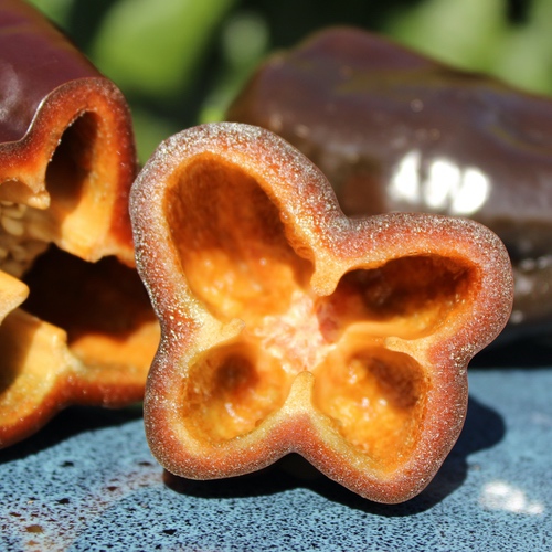 Capsicum annuum Schokoladenbrauner Paprika. Hat seinen Namen verdient, denn er schmeckt wirklich sehr süß, ist saftig und dickwandig. Einer der besten Paprika im Anbau. An Süße einer der Spitzenreiter. Wohlgeformte, blockig-längliche Früchte. Pflanzen liefern immer wieder neue Früchte. 10 Korn Standort: Sonne, Halbschatten Lebensform: einjährig Verwendung: Gemüse Verwendbare Teile: Früchte Wuchshöhe: 70cm