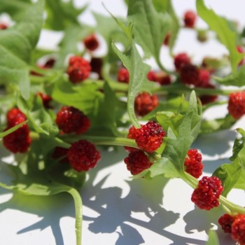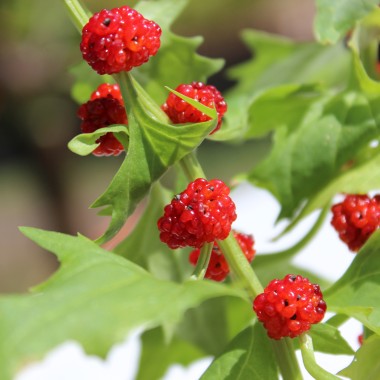 Chenopodium foliosum Der Star im Gemüsebeet wegen der knallroten saftigen Früchten, die wie Erdbeeren aussehen. Die Früchte schmecken wässrig süßlich und sind so hübsch! Die Pflanzen sind wie alle Gänsefußgewächse eigentlich mit dem zufrieden, was man ihnen bietet, also ganz anspruchslos. Blätter und Früchte können in allen möglichen Variationen aufgetafelt werden. 360 Korn Standort: Sonne, Halbschatten Lebensform: einjährig Verwendung: Salat, Gemüse Verwendbare Teile: Blätter, Früchte Wuchshöhe: 60cm