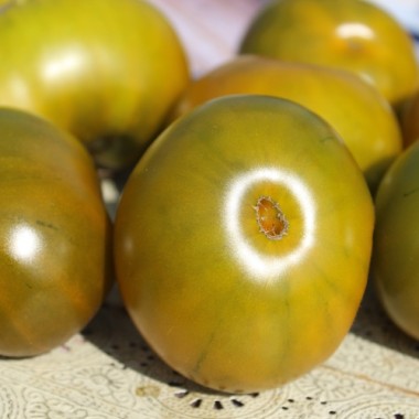 Lycopersicon esculentum Eine herrliche grüne Sorte! Die plattrunden, gerippten Früchte sind enorm groß, manche Exemplare können bis 1kg erreichen. Und das ohne viel Arbeit und Pflegeaufwand, denn die Pflanzen haben sich als sehr robust erwiesen. Von den großfrüchtigen Sorten auch die früheste. Der Geschmack ist sehr gut, süß-zitronig, sehr tomatig, mit viel Tiefe und Komplexität; umso lobenswerter, da sie auch bei schlechtem Wetter nicht versagte. Grüne Tomaten werden in der Regel ja sowieso unterschätzt, die meisten davon haben nämlich einen herausragenden Geschmack. 10 Korn Standort: Sonne, Halbschatten Lebensform: einjährig Verwendung: Gemüse Verwendbare Teile: Früchte Wuchshöhe: 180cm