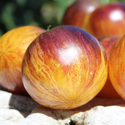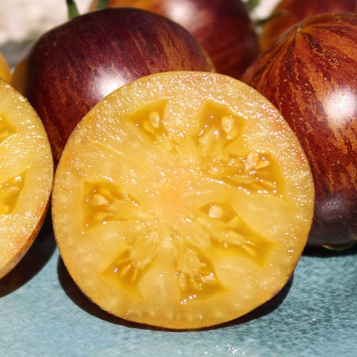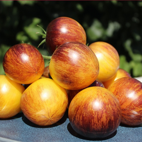 Lycopersicon esculentum Hübsche, mittelgroße Herzchen mit hellgelber Grundfarben und anthocyanen Streifen. Die blaue Farbe bildet sich auch ohne Sonnenlicht, so wie es bei den ersten blauen Sorten noch war.Das ist eine sehr ertragreiche Sorte, innen mehr Fleisch als Gel und ziemlich fest. Der Geschmack ist fruchtig-süß. Das Fleisch wird niemals mehlig.Pro Traube werden 6 Früchte von diesen Schönheiten gebildet. Mehr als man essen kann, hängen an den Pflanzen, also auch eine gute Sorte für die Verarbeitung und das Haltbarmachen.Diese Sorte ist eine Kreuzung aus der süßen Sorte Snow White und der süß-würzigen Tomate Rebel Starfighter Prime. 10 Korn Standort: Sonne, Halbschatten Lebensform: einjährig Verwendbare Teile: Früchte Verwendung: Gemüse Wuchshöhe: 150cm