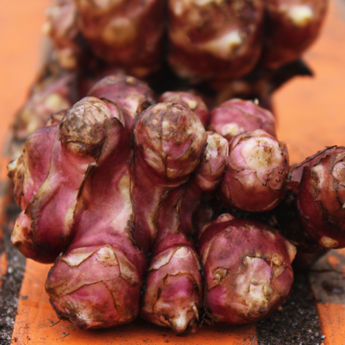 Helianthus tuberosus Riesig werdende Knollen. Eine einzelne kann nahezu 300g schwer werden. Sie sind außen violett. Sie sind sternenförmig um die ganze Knolle herum verzweigt. Wir bieten getopfte Pflanzen an, keine losen Knollen. Die Pflanzen können das ganze Jahr über gepflanzt werden. Erntezeitpunkt: Herbst und den gesamten Winter hindurch bis zum Frühjahr Standort: Sonne, Halbschatten Lebensform: winterhart, mehrjährig Verwendbare Teile: Knolle Verwendung: Gemüse Wuchshöhe: 250cm Topfgröße: 0,35l