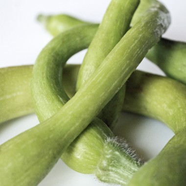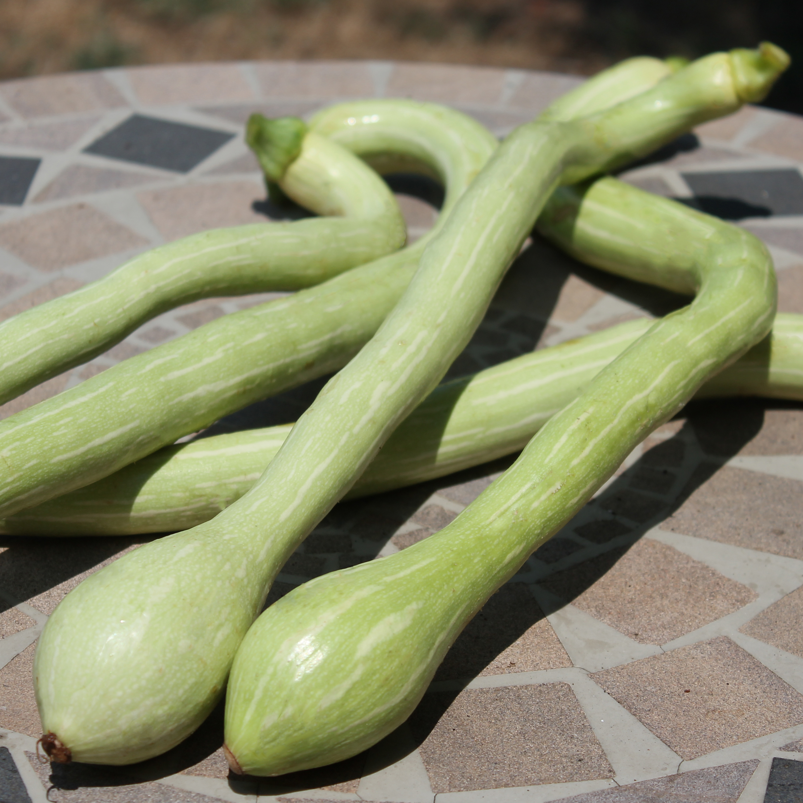 Cucurbita pepo Die italienische Sorte kann liegend und rankend angebaut werden. Kletternd werden die Früchte kerzengerade, unten etwas verdickt wie eine Keule. Liegend winden und verdrehen sie sich in alle möglichen Richtungen. Die Früchte ernten, wenn sie zwischen 25 bis 60cm lang sind, dann sind sie noch besonders zart. Die Haut ist hellgrün mit hellen Längsstreifen. Der komplette Hals besteht aus festem, nicht wässrigem Fruchtfleisch ohne Kerne. Nur vorn an der Verdickung befindet sich das Kerngehäuse, das bei jungen Früchten noch fest ist. Der Geschmack ist nussig-aromatisch.Wer regelmäßig erntet, sorgt für neue Blüten und eine lange Erntezeit. 10 Korn Standort: Sonne, Halbschatten Lebensform: einjährig Verwendbare Teile: Früchte Verwendung: Gemüse Wuchshöhe: 40cm