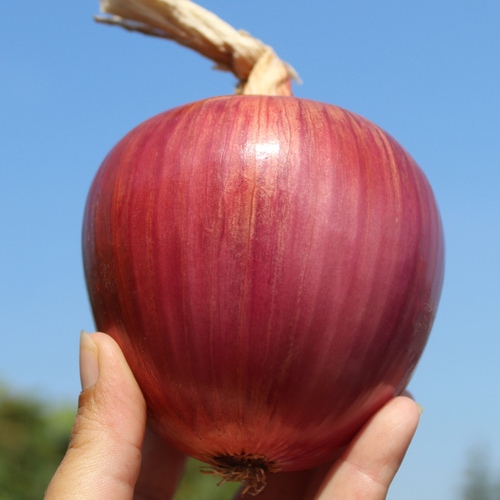 Allium cepa Berühmte Zwiebel aus Kalabrien. Ihr zu Ehren wird ein eigenes Fest gefeiert. Sie sind sehr zart und süß. Sehr gut frisch für Salate, Aufläufe und Saucen. Übrigens auch die Lieblingszwiebel von Jamie Oliver. Die Zwiebeln sind breitschultrig, sehr groß und rot. Rezept: Zwiebeltorte Quarkölteig: trocken mischen: 200g Mehl, ½ TL Salz, ½ Päckchen Backpulver dazu geben: 75 ml Milch, 125g Magerquark, 50ml Milch für den Belag: anbraten 750g Zwiebelstreifen, 100g gewürfelten Schinken, salzen, pfeffern Soße für die Zwiebeln: 1 Ei, 250 ml Milch, 150g Schmand, 25g Stärke, Muskat, Salz Teig kneten, in eine Springform geben, Seiten der Springform ebenfalls mit dem Teig auskleiden. Zwiebelmasse einfüllen, Soße darübergeben und 45min bei 180° backen. Bild 5: vor der Ernte der Zwiebeln das Laub für den Salat oder aufs Brot ernten 150 Korn Standort: Sonne, Halbschatten Lebensform: einjährig Verwendung: Gemüse Verwendbare Teile: Früchte Wuchshöhe: 20cm