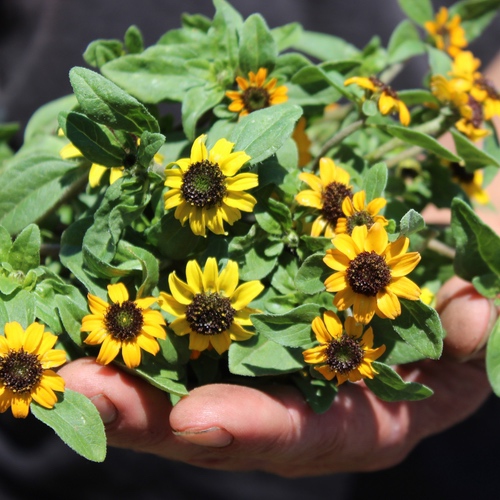 Sanvitalia procumbens Gelbe und gelborange, das sind die zwei Farben der Blüten. In der Mitte jeweils von einem dunkelbraunen, fast schwarzen Auge säumen sich die Blütenblätter herum, fast wie Minisonnenblumen. Die Pflanzen aus Mexiko werden nicht höher als 10cm und werden als Pollenspender für unsere Löcherbienen, eine Solitärbiene, genutzt. 150 Korn Standort: Sonne, Halbschatten Lebensform: einjährig Verwendbare Teile: nicht essbar Verwendung: Bienen- und Insektenweide Wuchshöhe: 10cm